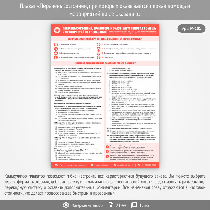 Плакат «Перечень состояний, при которых оказывается первая помощь и мероприятий по ее оказанию» (на основе Приказа от 04.05.2012 N 477н) (М-101, 1 лист)