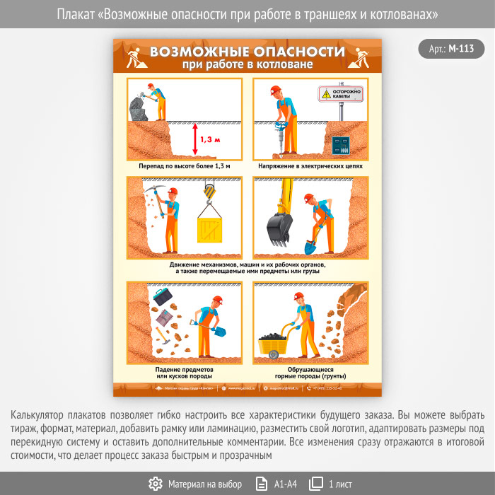 Плакат «Возможные опасности при работе в траншеях и котлованах» (М-113, 1 лист)