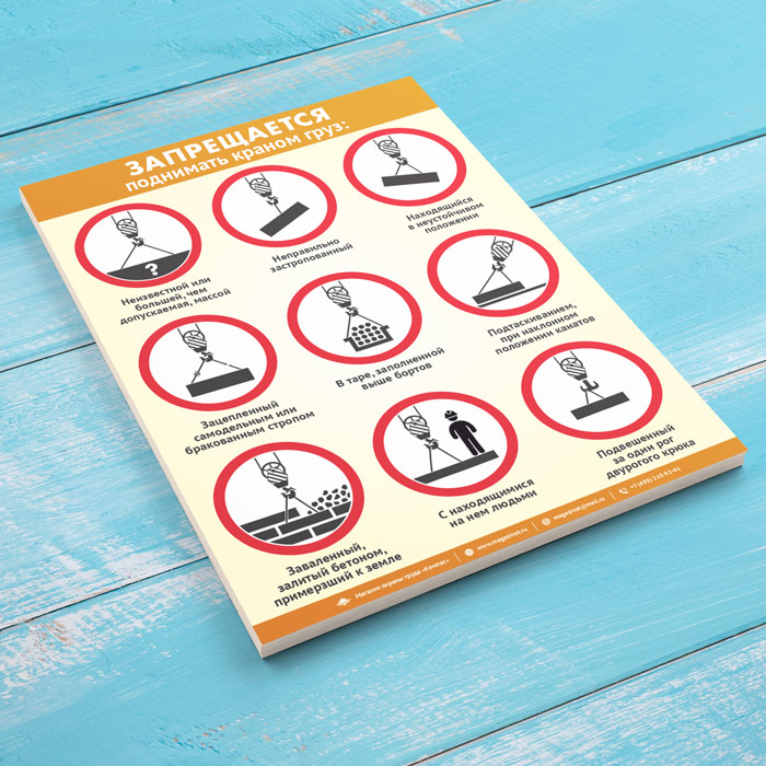 Плакат «Запрещается поднимать краном груз» содержит блок запрещающих знаков, наглядно иллюстрирующих ситуации, при которых запрещается поднимать груз краном