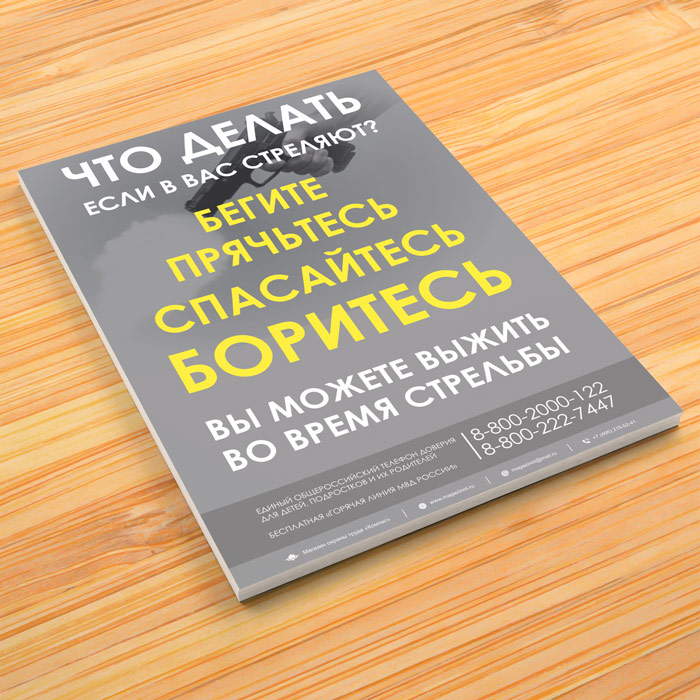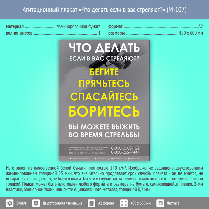 Агитационный плакат «Что делать если в вас стреляют?» может быть изготовлен любого формата и размера, на бумаге, самоклеящейся пленке, пластике, баннерной ткани и металле. Разрабатываем, рисуем и изготавливаем плакаты на любую интересующую Вас тематику