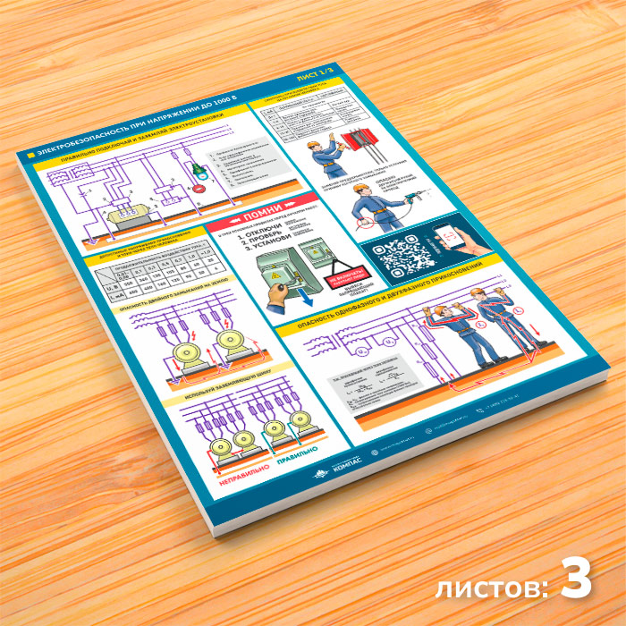 Комплект плакатов из 3-х листов «Электробезопасность при напряжении до 1000В» содержит основополагающую информацию о технике безопасности при работе с электричеством, напряжением до 1000В. Вы узнаете о правилах обращения с электричеством и электрооборудованием, защитных устройствах и воздействие тока на организм человека, правилах заземлении и прочем