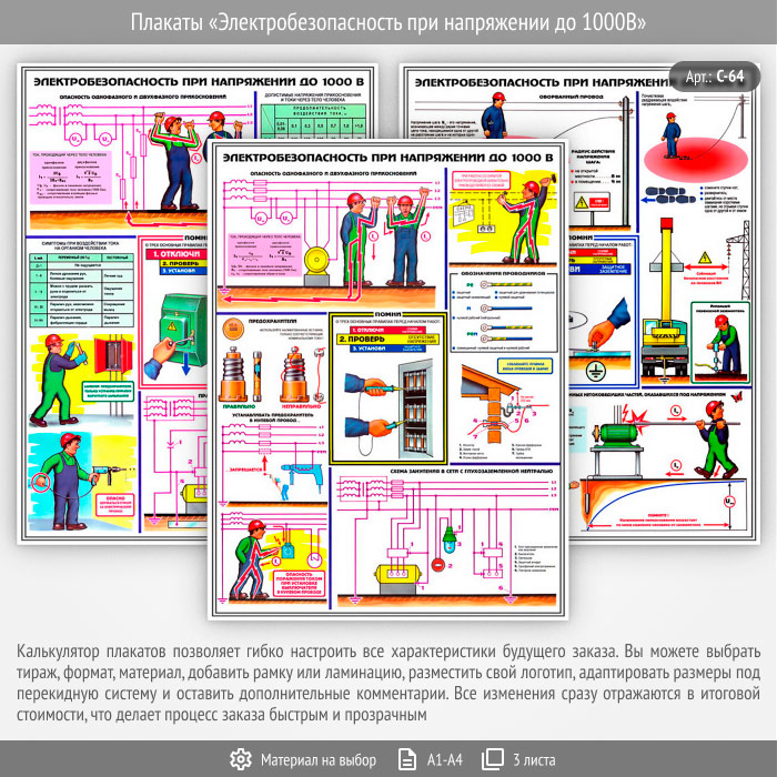 Плакаты «Электробезопасность при напряжении до 1000В» (С-64, 3 листа)