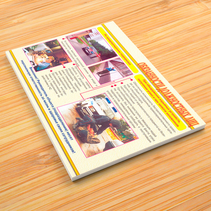 - Плакат «Обязанности должностных лиц» – по предупреждению терроризма и при обнаружении взрывных устройств, получении угроз и при захвате заложников