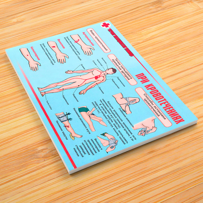 - Плакат «При кровотечениях» – Виды кровотечений, точки пальцевого прижатия артерий, способы остановки кровотечений