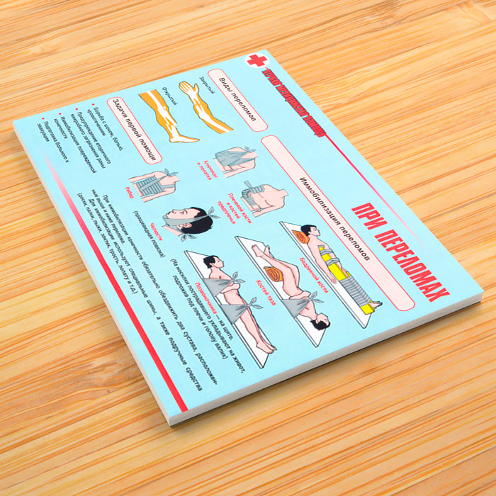 - Плакат «При переломах» – виды переломов, иммобилизация переломов, задачи первой помощи