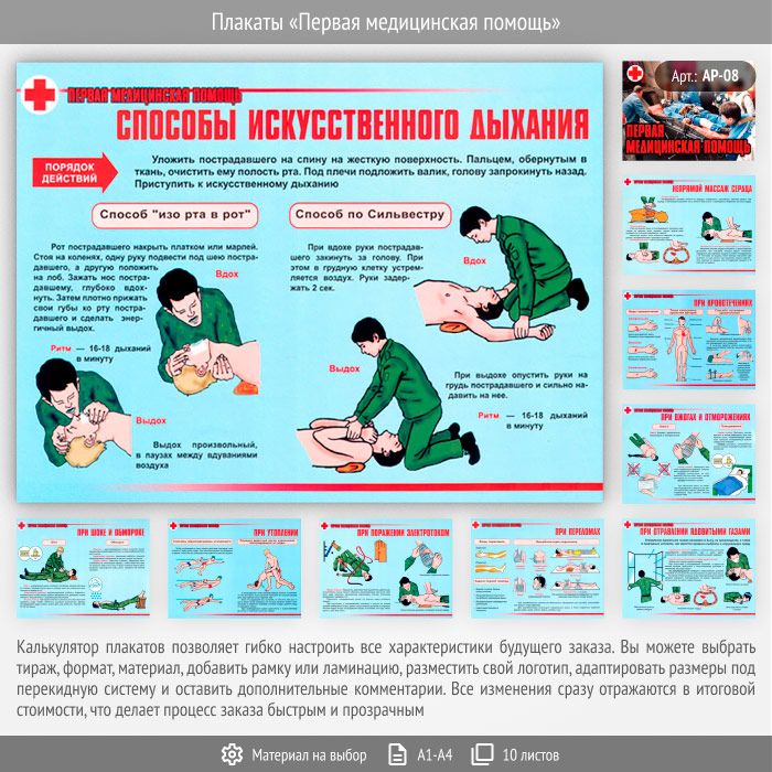 Комплект плакатов «Первая медицинская помощь» из 10 листов может быть изготовлен любого формата и размера, на бумаге, самоклеящейся пленке, пластике, баннерной ткани и металле. Разрабатываем, рисуем и изготавливаем плакаты на любую интересующую Вас тематику