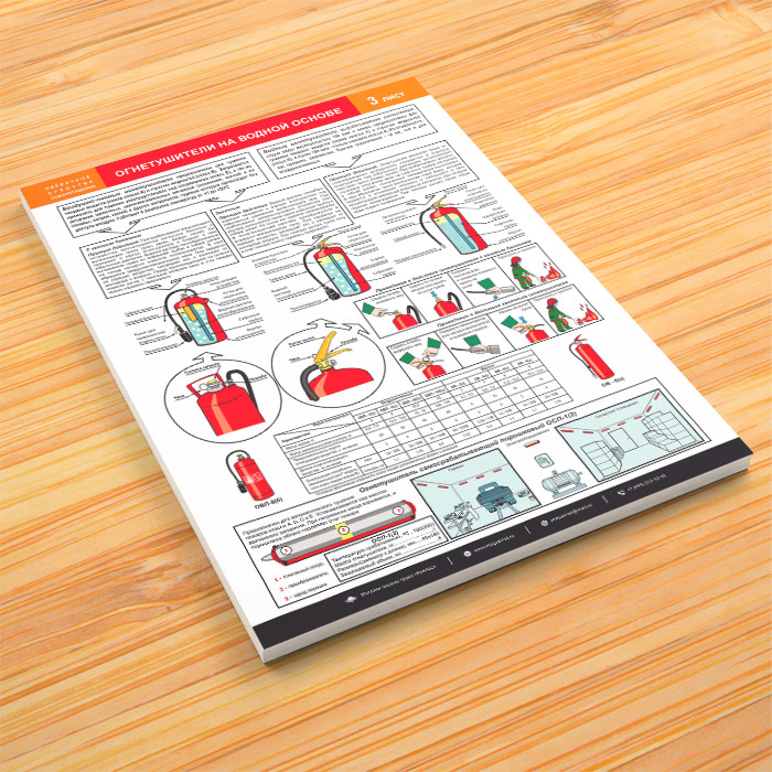 - Плакат «Тушение пожаров огнетушителями» – классы пожаров A, B, C, D, E, F, размещение огнетушителей в общественных зданиях и сооружениях