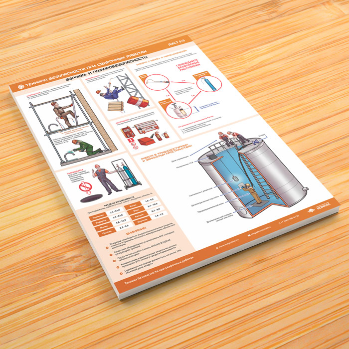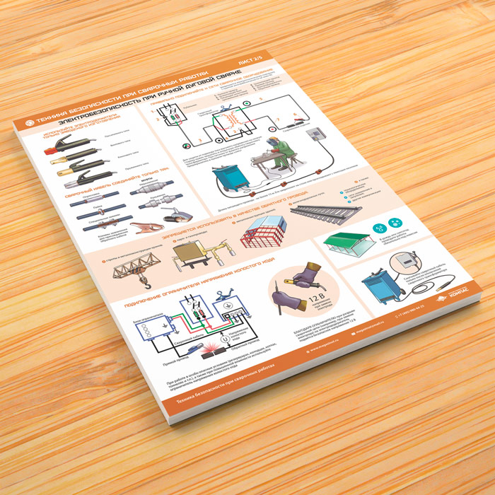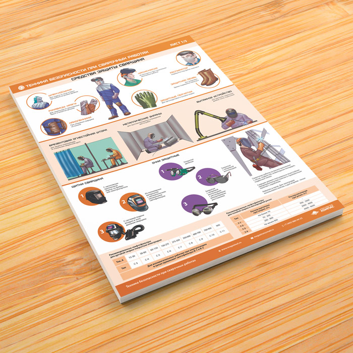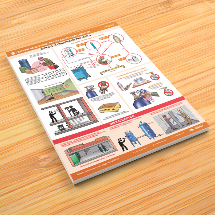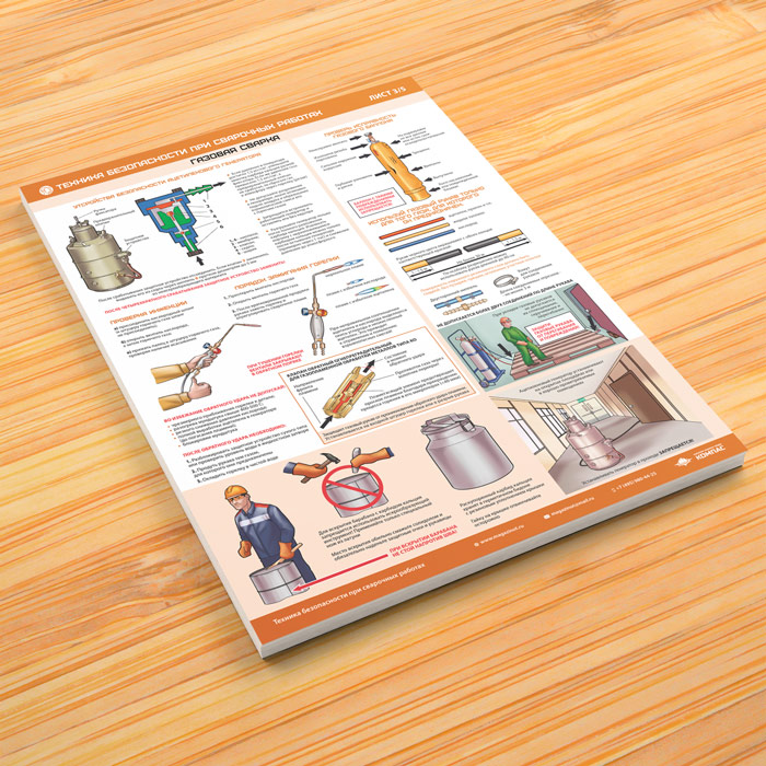 Комплект плакатов «Техника безопасности при сварочных работах» из 5 листов может быть изготовлен любого формата и размера, на бумаге, самоклеящейся пленке, пластике, баннерной ткани и металле. Разрабатываем, рисуем и изготавливаем плакаты на любую интересующую Вас тематику