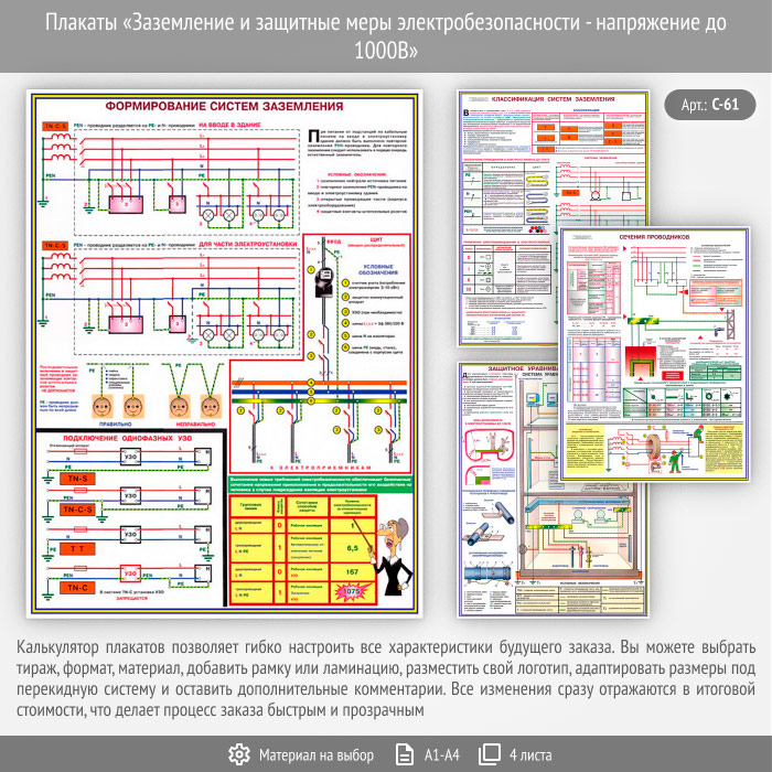 Комплект плакатов «Заземление и защитные меры электробезопасности - напряжение до 1000В» из 4 листов – достойное качество и полезная информация по приемлемой цене