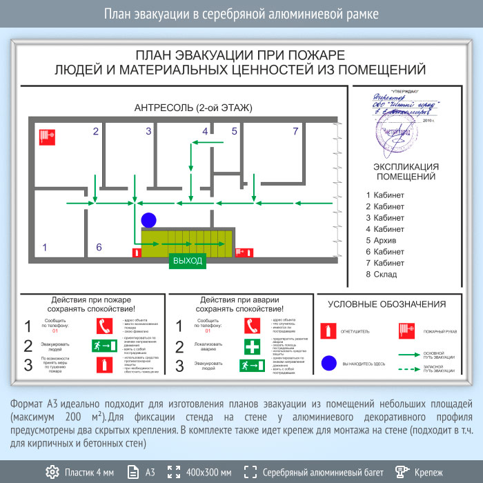 Формат А3 идеально подходит для изготовления планов эвакуации из помещений небольших площадей (максимум 200 м2). Содержит схематичное Изображение помещения с размещенными на нем средствами пожаротушения, путями эвакуации и условными обозначениями. Также содержит краткую инструкцию к действиям при пожаре