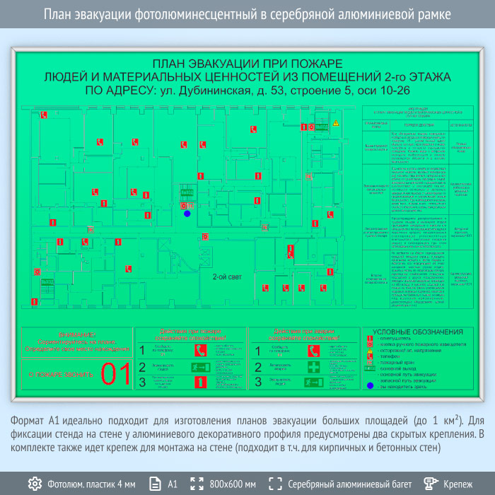 Формат А1 идеально подходит для изготовления планов эвакуации больших площадей (до 1 км2) с большим количеством пожарного инвентаря. Содержит схематичное Изображение помещения с размещенными на нем средствами пожаротушения, путями эвакуации и условными обозначениями. Также содержит инструкцию при пожаре