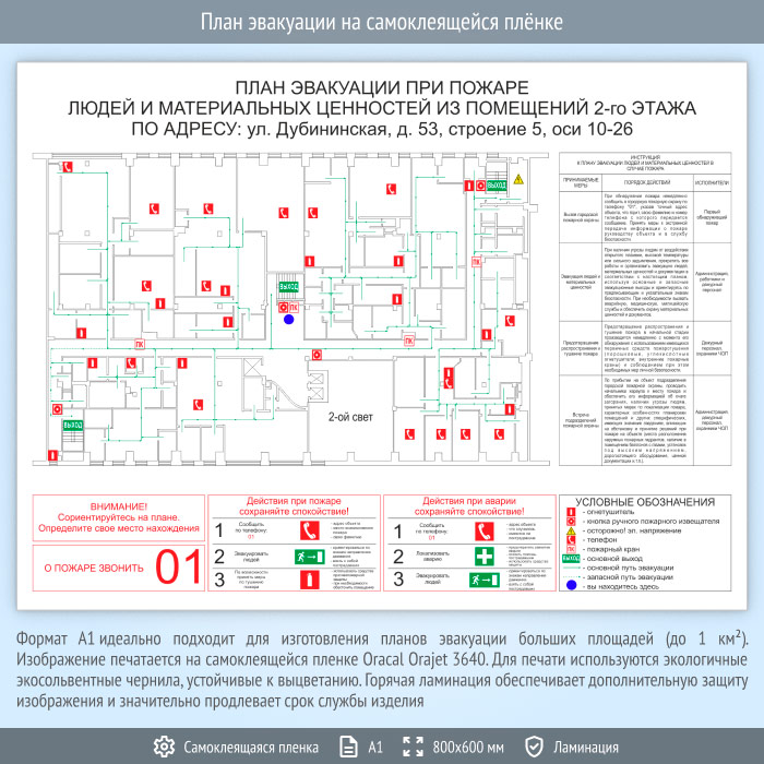 Формат А1 идеально подходит для изготовления планов эвакуации больших площадей (до 1 км2) с большим количеством пожарного инвентаря. Содержит схематичное Изображение помещения с размещенными на нем средствами пожаротушения, путями эвакуации и условными обозначениями. Также содержит инструкцию при пожаре