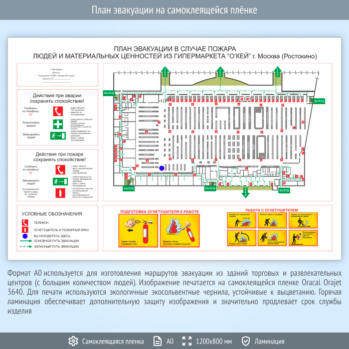 Формат А0 используется для изготовления маршрутов эвакуации из зданий торговых и развлекательных центров (с большим количеством людей). Содержит схематичное Изображение помещений с размещенными на нем средствами пожаротушения и извещения, путями эвакуации и условными обозначениями. Содержит инструкцию при пожаре и инструкцию к подготовке и использованию огнетушителя