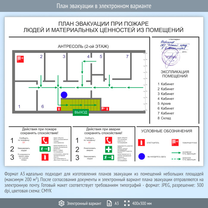 Формат А3 идеально подходит для изготовления планов эвакуации из помещений небольших площадей (максимум 200 м2). Содержит схематичное Изображение помещения с размещенными на нем средствами пожаротушения, путями эвакуации и условными обозначениями. Также содержит краткую инструкцию к действиям при пожаре