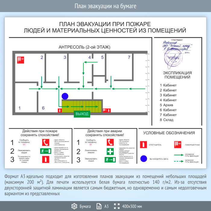 Формат А3 идеально подходит для изготовления планов эвакуации из помещений небольших площадей (максимум 200 м2). Содержит схематичное Изображение помещения с размещенными на нем средствами пожаротушения, путями эвакуации и условными обозначениями. Также содержит краткую инструкцию к действиям при пожаре
