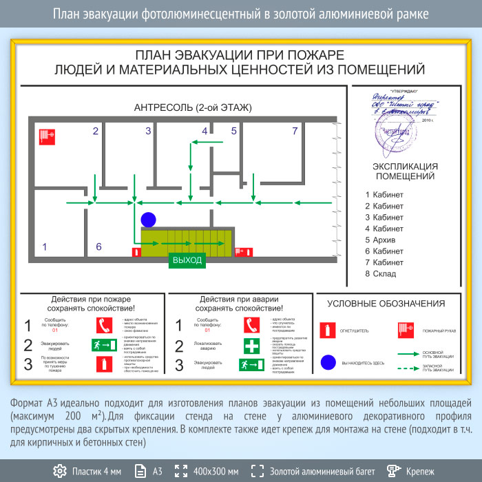 Формат А3 идеально подходит для изготовления планов эвакуации из помещений небольших площадей (максимум 200 м2). Содержит схематичное Изображение помещения с размещенными на нем средствами пожаротушения, путями эвакуации и условными обозначениями. Также содержит краткую инструкцию к действиям при пожаре