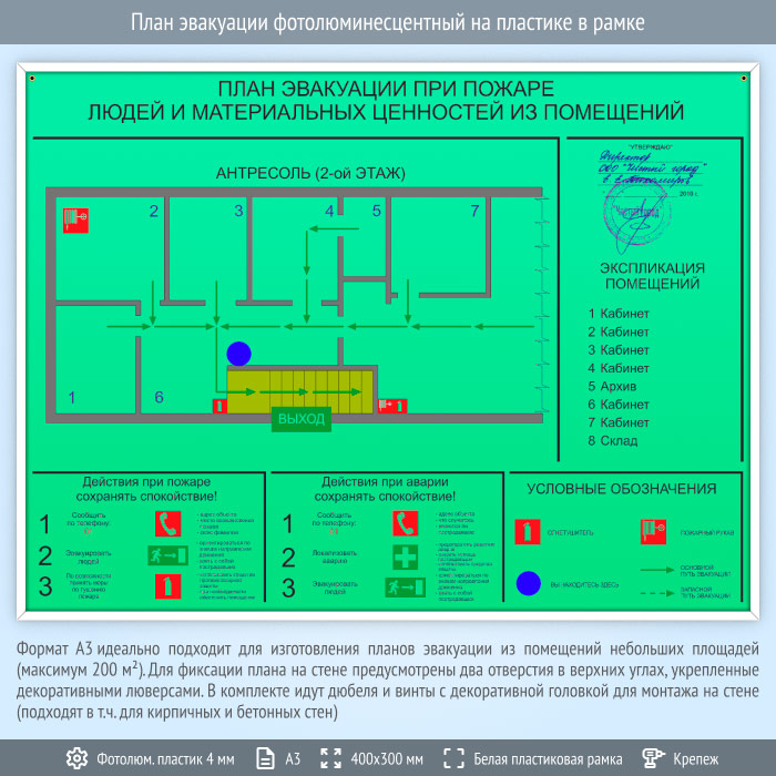 Формат А3 идеально подходит для изготовления планов эвакуации из помещений небольших площадей (максимум 200 м2). Содержит схематичное Изображение помещения с размещенными на нем средствами пожаротушения, путями эвакуации и условными обозначениями. Также содержит краткую инструкцию к действиям при пожаре