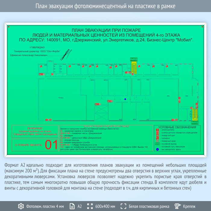 Формат А2 идеально подходит для изготовления планов эвакуации из помещений небольших площадей (максимум 200 м2). Содержит схематичное Изображение помещения с размещенными на нем средствами пожаротушения, путями эвакуации и условными обозначениями. Также содержит краткую инструкцию к действиям при пожаре