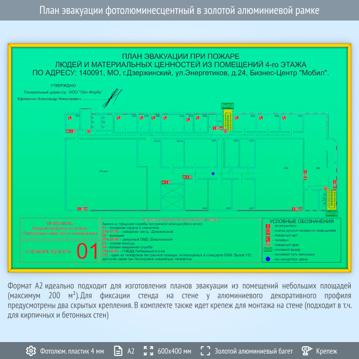 План эвакуации фотолюминесцентный в золотой алюминиевой рамке (А2 формат)