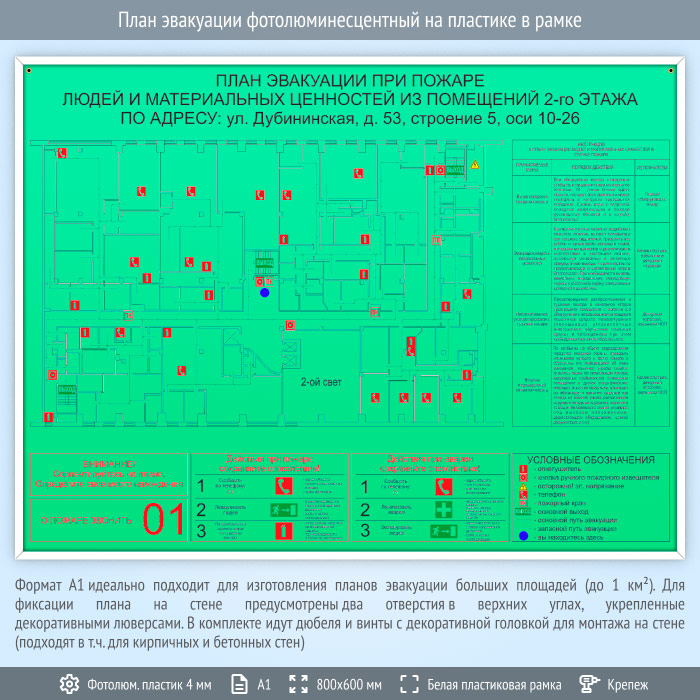 Формат А1 идеально подходит для изготовления планов эвакуации больших площадей (до 1 км2) с большим количеством пожарного инвентаря. Содержит схематичное Изображение помещения с размещенными на нем средствами пожаротушения, путями эвакуации и условными обозначениями. Также содержит инструкцию при пожаре