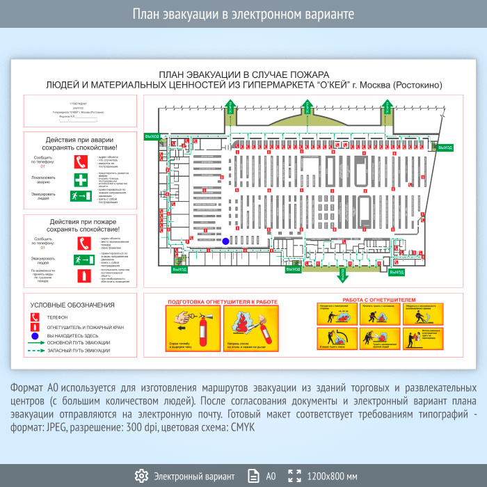 Формат А0 используется для изготовления маршрутов эвакуации из зданий торговых и развлекательных центров (с большим количеством людей). Содержит схематичное Изображение помещений с размещенными на нем средствами пожаротушения и извещения, путями эвакуации и условными обозначениями. Содержит инструкцию при пожаре и инструкцию к подготовке и использованию огнетушителя