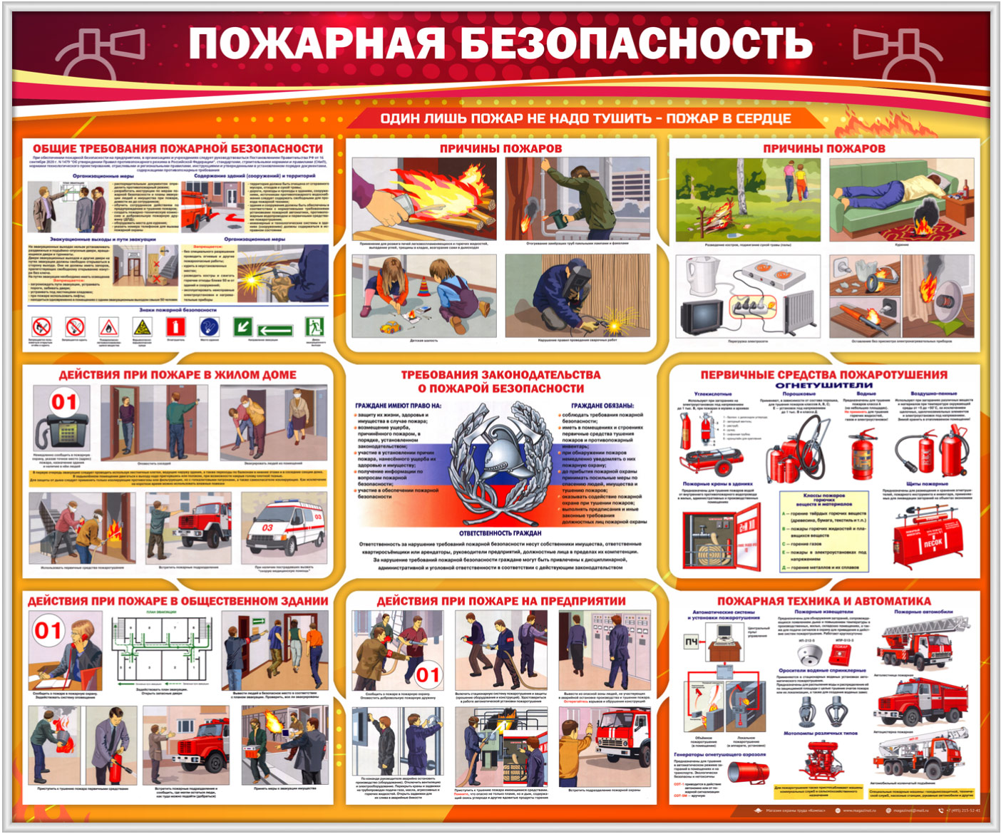 Стенд «Пожарная безопасность» наглядно демонстрирует общие требования пожарной безопасности: причины пожаров, первичные средства пожаротушения и пожарная техника и автоматика, действия при пожаре в жилом доме, общественном здании, на предприятии, требования законодательства о пожарной безопасности и общие требования…