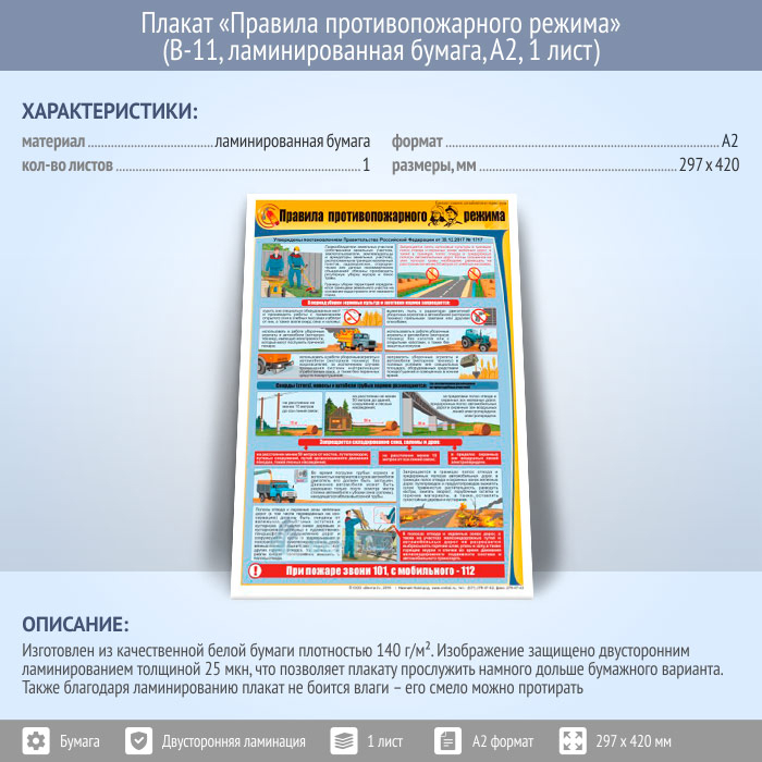 Плакат «Правила противопожарного режима» (В-11, ламинированная бумага, А2, 1 лист)