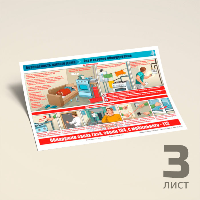 Комплект плакатов из 3 листов «Безопасность жилого дома» описывает правила пожарной безопасности в квартирах и местах общего пользования, правила безопасной эксплуатации газового оборудования