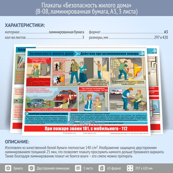 Плакаты «Безопасность жилого дома» (пожарная безопасность, газ и газовое оборудование, действия при возникновении пожара) (В-08, ламинированная бумага, А3, 3 листа)