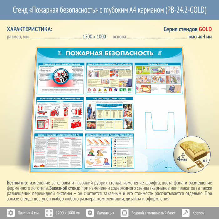 Стенд «Пожарная безопасность» с глубоким А4 карманом (PB-24.2-GOLD)
