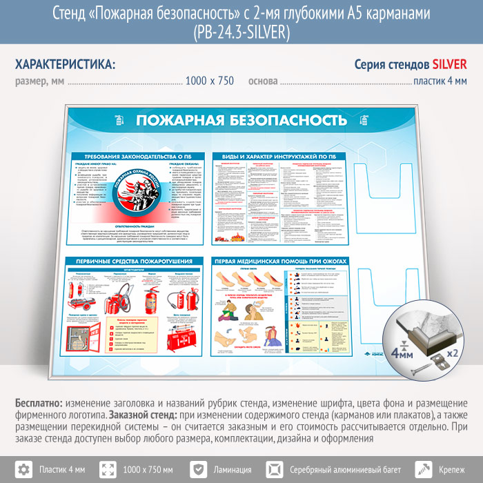 Стенд «Пожарная безопасность» с 2-мя глубокими А5 карманами (PB-24.3-SILVER)