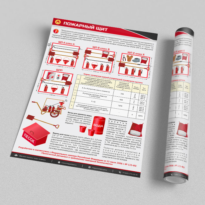 В плакате «Пожарный щит» наглядно изображена необходимая комплектация щитов ЩП-А, ЩП-В, ЩП-Е и ЩПП, описаны нормы оснащения зданий (сооружений) пожарными щитами, рассказано о требованиях к бочкам для хранения воды, ящикам с песком и пожарному полотну. Плакат разработан в соответствии с ФЗ РФ от 22.07.2008 № 123-ФЗ «Технический регламент о требованиях пожарной безопасности»