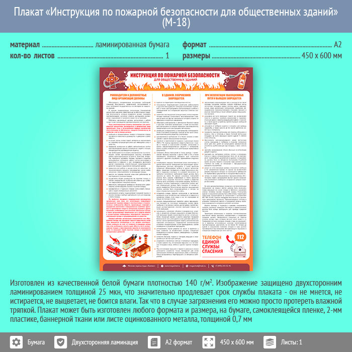 Плакат «Инструкция по пожарной безопасности для общественных зданий» (М-18, ламинированная бумага, А2, 1 лист)