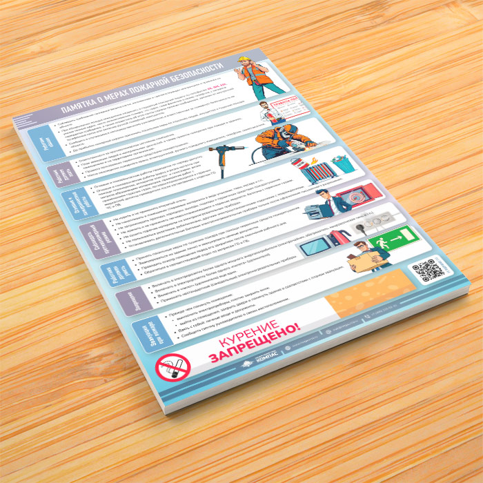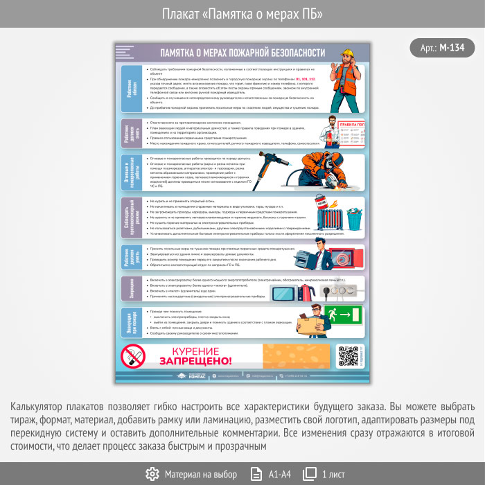 Плакат «Памятка о мерах ПБ» с QR (М-134) — это наглядное руководство с ключевыми правилами поведения при пожаре и основными требованиями противопожарного режима. Содержит пошаговые действия при обнаружении возгорания, порядок эвакуации, правила обращения с огнеопасными веществами и пользования первичными средствами пожаротушения. Подходит для размещения в офисах, производственных помещениях, учреждениях и на объектах с повышенными требованиями к пожарной безопасности.