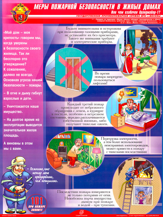 Комплект плакатов «Меры пожарной безопасности в жилых домах» из 2 листов служит для обучения мерам недопущения пожара и необходимым действиям в случае его возникновения. Комплект из двух плакатов, рассказывающих о правилах пожарной безопасности в жилом доме