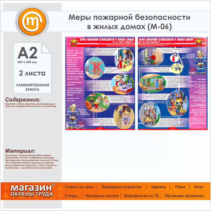 Плакаты «Меры пожарной безопасности в жилых домах» (М-06, ламинированная бумага, А2, 2 листа)