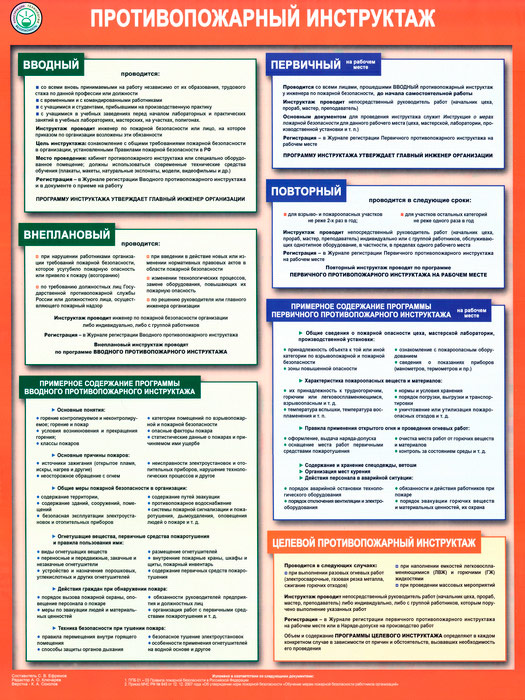 Плакат «Противопожарный инструктаж» содержит таблицу с порядком, сроками и целями следующих противопожарных инструктажей: вводного и внепланового инструктажей, первичного, повторного и целевого инструктажей, содержит примерное содержание программы противопожарного инструктажа на рабочем месте