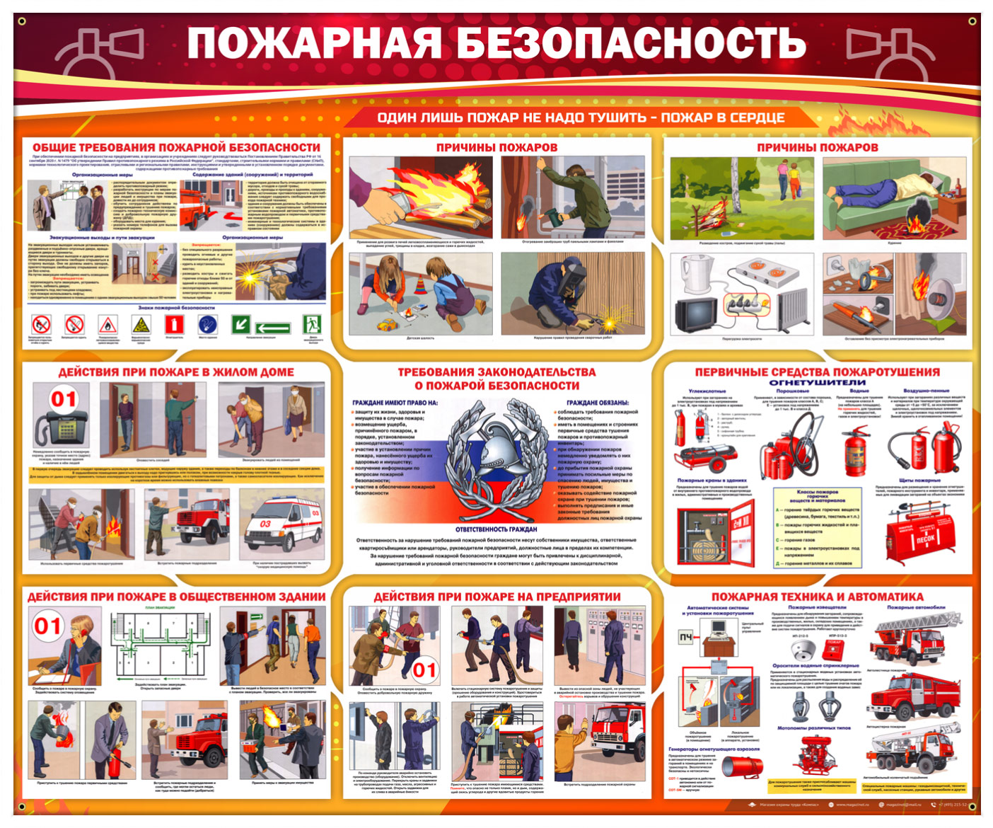 Стенд «Пожарная безопасность» наглядно демонстрирует общие требования пожарной безопасности: причины пожаров, первичные средства пожаротушения и пожарная техника и автоматика, действия при пожаре в жилом доме, общественном здании, на предприятии, требования законодательства о пожарной безопасности и общие требования…