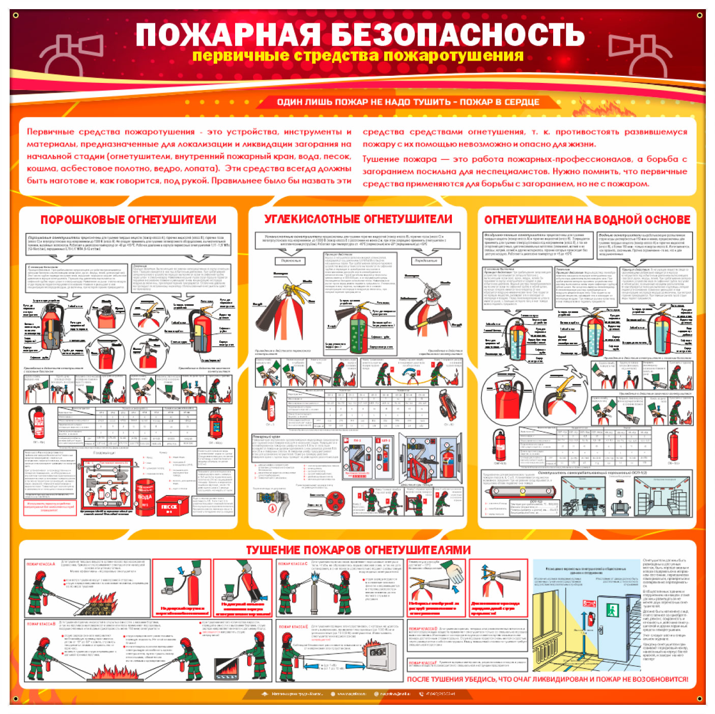 Стенд «Пожарная безопасность. Первичные средства пожаротушения» – это яркое пособие для изучения первичных средств пожаротушения: порошковые огнетушители, углекислотные и огнетушители на водной основе – их устройство, хранение и использование, а также примеры как правильно использовать огнетушители во время пожара…