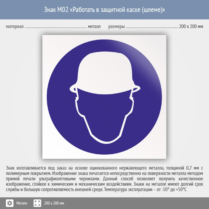 Знак M02 «Работать в защитной каске (шлеме)» (металл, 200х200 мм)
