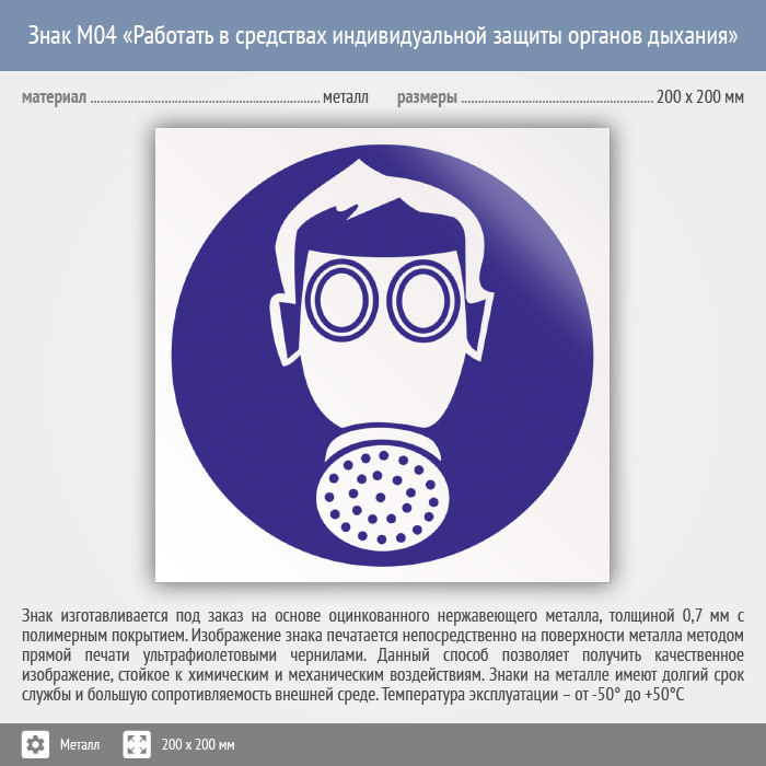 Знак M04 «Работать в средствах индивидуальной защиты органов дыхания» (металл, 200х200 мм)