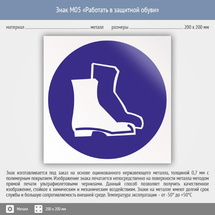 Знак M05 «Работать в защитной обуви» (металл, 200х200 мм)