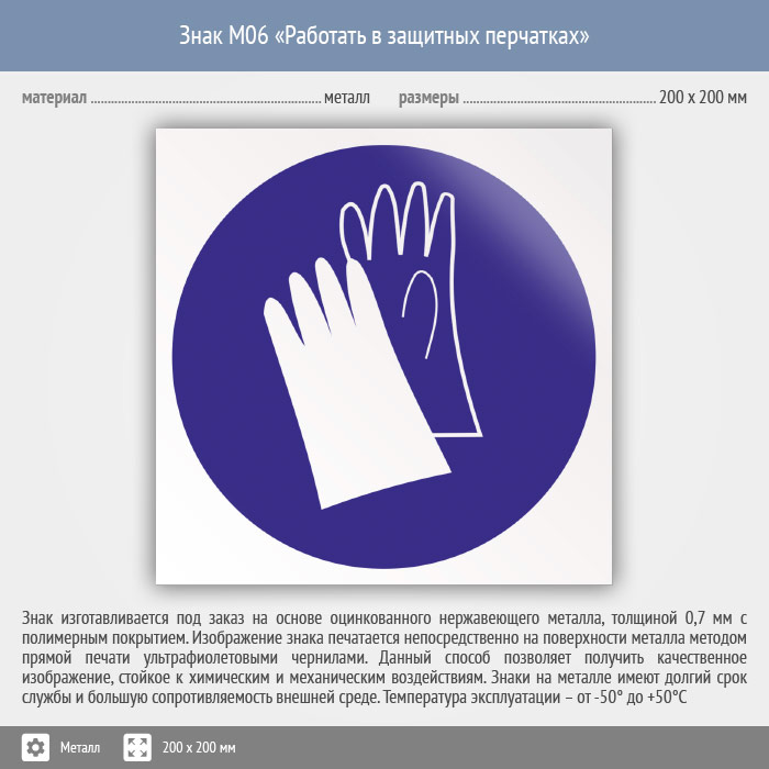 Знак M06 «Работать в защитных перчатках» (металл, 200х200 мм)
