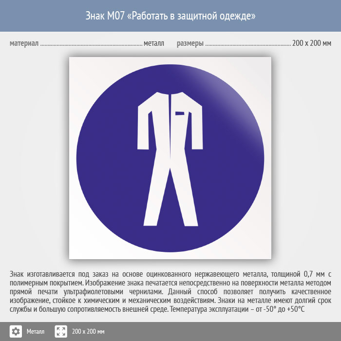 Знак M07 «Работать в защитной одежде» (металл, 200х200 мм)