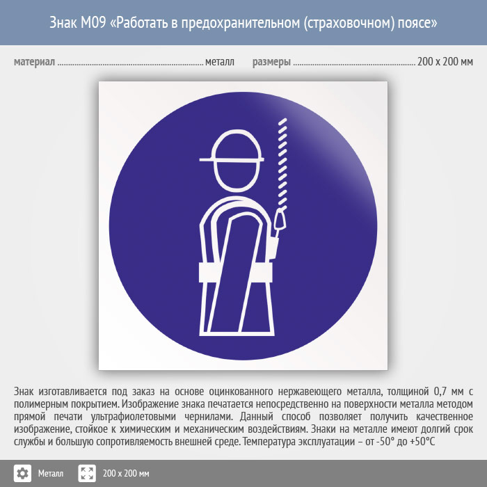 Знак M09 «Работать в предохранительном (страховочном) поясе» (металл, 200х200 мм)