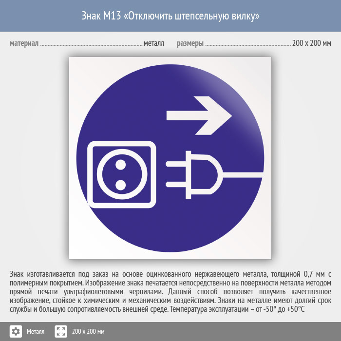 Знак M13 «Отключить штепсельную вилку» (металл, 200х200 мм)