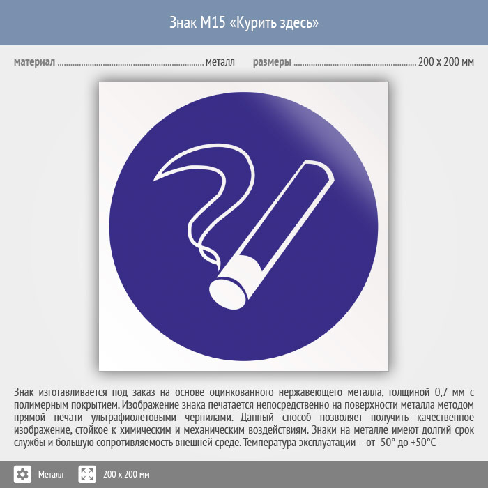 Знак M15 «Курить здесь» (исключен) на металле, размером 200х200 мм обозначает место для курения. Предписывающие знаки безопасности изготовлены согласно ГОСТ Р 12.4.026-2015 и предназначены для обозначения обязательных действий с целью избежания возможных травм и прочих опасностей