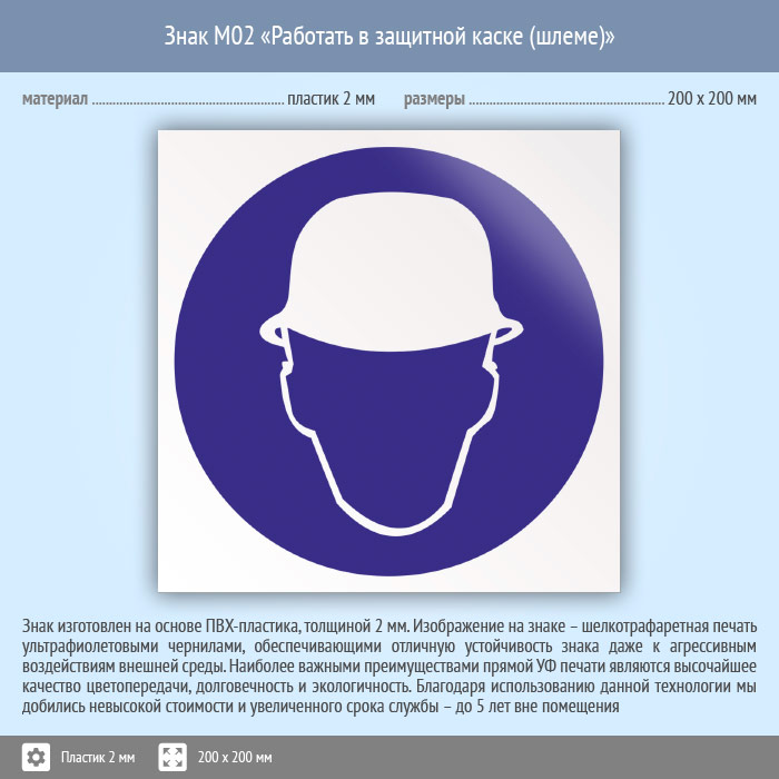 Знак M02 «Работать в защитной каске (шлеме)» (пластик, 200х200 мм)