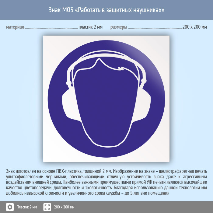 Знак M03 «Работать в защитных наушниках» (пластик, 200х200 мм)