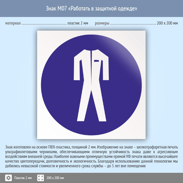 Знак M07 «Работать в защитной одежде» (пластик, 200х200 мм)
